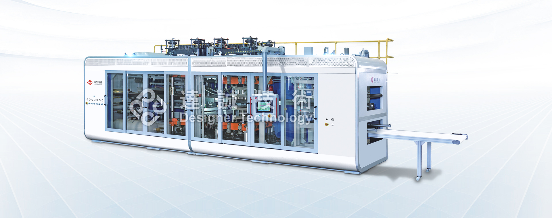 成型工位、沖孔工位、沖剪工位采用上下兩組伺服電機控制,驅動偏心輪連桿結構分別帶動兩模臺上下運動并配備正負壓氣源,可實現產品正負壓成型。